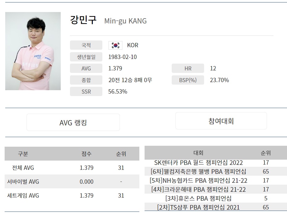 2021-2022시즌 PBA투어 경기 상금 랭킹- 강민구 당구선수