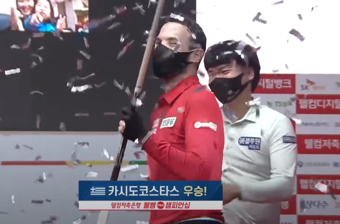 강민구 당구선수가 PBA투어 첫 결승전 진출후 져서 준우승을 하고 그리스 당구선수인 필리포스 카시도코스타스를선수를 축하하는 모습입니다.