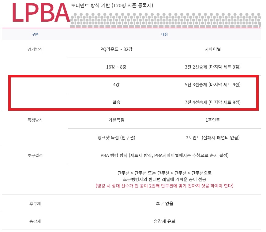 위의 내용은 사단법인 프로당구협회(PBA)가 PBA 홈페이지를 통해 공지해둔 세계 및 국내 여자프로당구선수들이 출전하는 LPBA 투어 프로당구대회 경기방식 경기규칙입니다. 이 내용은 PBA-LPBA 프로당구 대회 경기방식 변경으로 언제든 변경될 수 있다는 점 염두에 두시고 참고하시기 바랍니다.