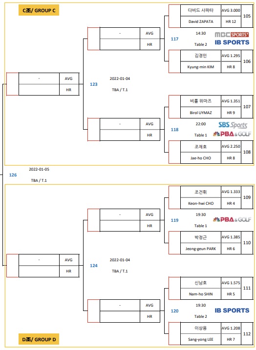 1월 3일부터 펼쳐지는 NH농협카드 PBA투어 16강 대진표(1)을 살펴보면 이종주(1.750)는 애버리지 1.333을 치고 있는 이병진 선수와 맞붙게 되며, AVG 2.545 박광열 선수는 이번대회 애버리지가 저조한 스페인의 하비에르 팔라존(AVG 1.800) 선수와 벨기에의 프레드릭 쿠드롱 선수(애버리지 2.065)는 오랫만에 상위권에 올라 온 그리스의 코스타스 파파콘스타니뉴 선수(에버리지 1.250)와, 임성균 선수(애버리지 1.513)는 남경훈 선수(애버리지 1.395)와 16강 대진표에 따른 8강 진출을 가리는 3쿠션 프로 당구대회를 펼칩니다.