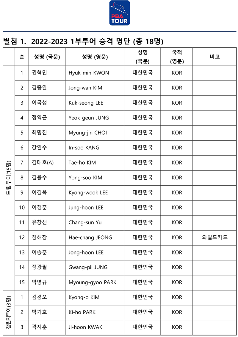 프로당구협회(PBA∙총재 김영수)는 25일 챌린지투어 6차전을 끝으로 21-22시즌 2~3부투어가 종료됨에 따라, 차기 시즌 1부투어 승격 명단을 발표했다. 드림투어는 상위 15위까지, 챌린지투어는 상위 3위까지다.
