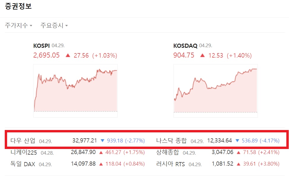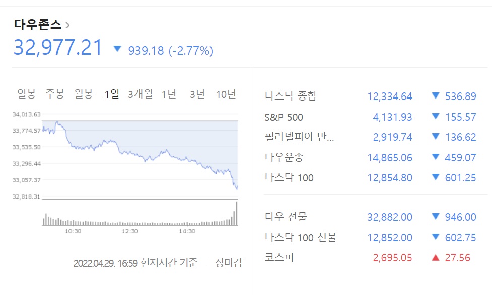 4월 29일의 뉴욕 주식 시장의 다우 공업 주식 30개 종목의 평균은 급락했습니다. 전날과 비교한 하락폭은 일시적으로 천달러를 넘었습니다. 종가는 전일대비 939.18달러 하락한 3만 2977.21달러로, 3월 중순 이래, 약 1개월반만의 하한가 수준이 되었습니다.