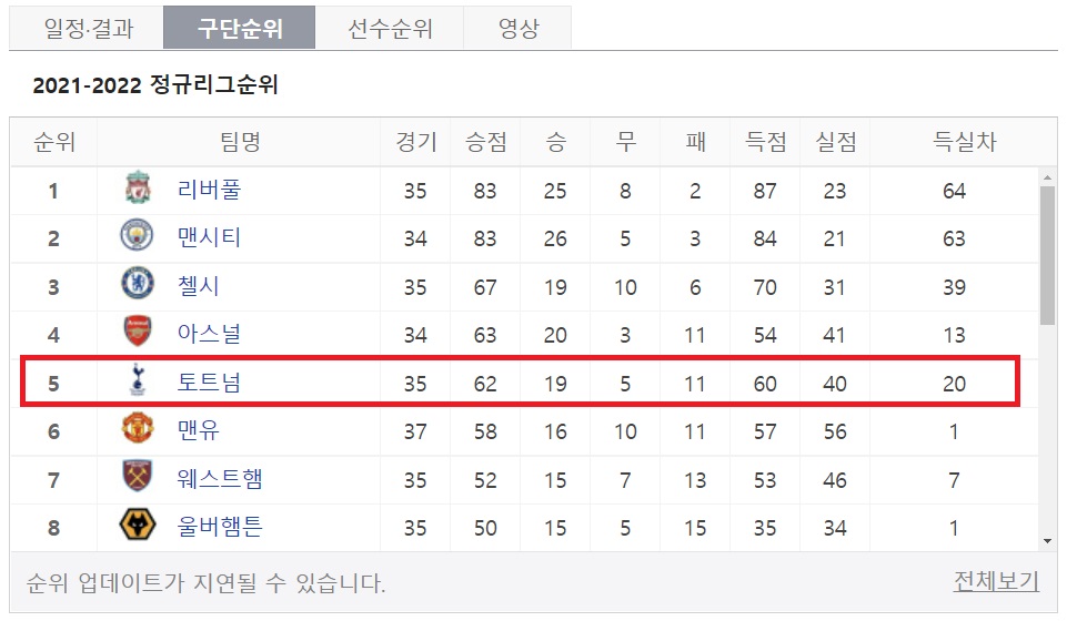 리버풀 토트넘 경기결과? 손흥민 리그 20골 달성 챔피언스리그 출전 가능성은 불확실(프리미어리그 순위)