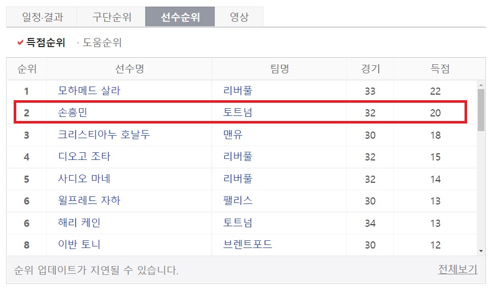 5월8일 새벽(한국 시간) 영국 안필드에서 열린 2021-22 잉글랜드 프리미어리그 36라운드, 리버풀과 토트넘의 경기는 1:1 무승부로 끝이 났습니다. 하지만 손흥민은 후반전 56분에 선제골을 넣으면서 아시아 선수 최초로 리그 20골의 신기록을 세우며 리버풀 살라 선수가 가지고 있는 득점 1위(22골) 자리에 바짝 다가섰습습니다.